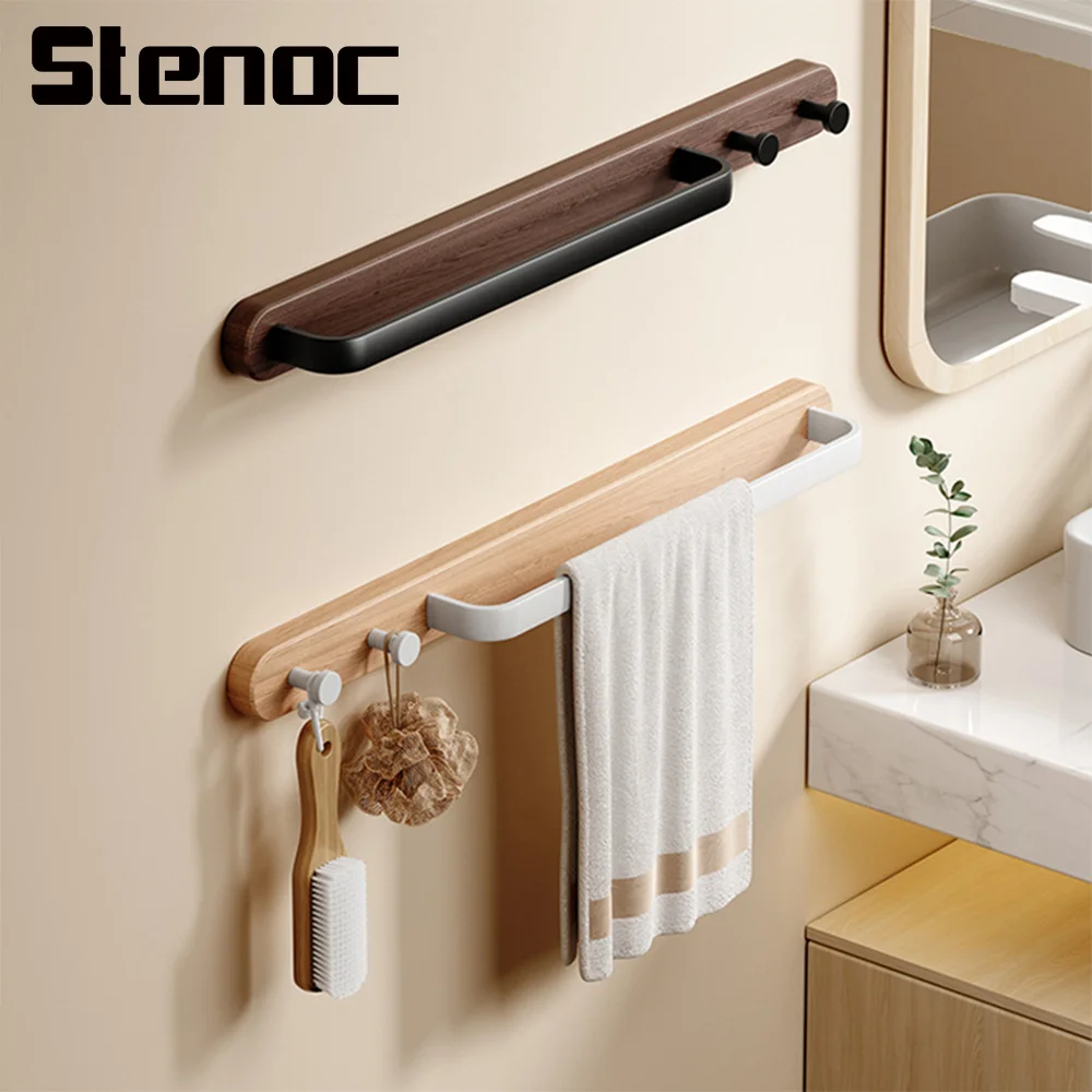 Stenoc – porte-serviettes mural en bois massif, avec crochets, poteau à serviettes en aluminium, porte-serviettes d'hôtel, support de rangement, accessoires de salle de bains