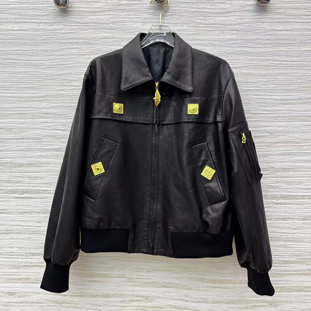 Manteau de luxe en cuir de mouton pour femmes, Style moto rétro, revers, manches longues, lèvres dorées, boutons avec fermeture éclair, Streetwear, veste Cool, 100%