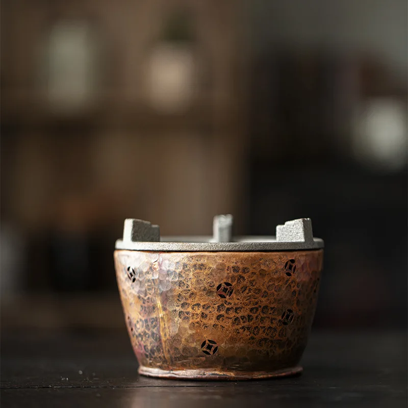 Réchaud à thé en cuivre pur martelé artisanal de qualité supérieure, motif pièce de monnaie ancienne, réchaud à charbon, objet de collection de vaisselle à thé chinoise