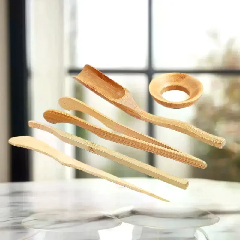 Ensemble de service à thé carbonisé en bambou, plateau à thé, cuillère à café, pince à thé, aiguille, outil de fabrication de thé exquis, accessoires cuillère, pinces, 3/4/5 pièces