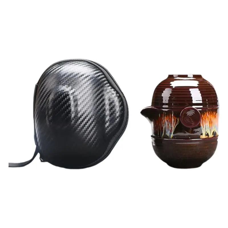 Service à thé portable AT63, vaisselle en porcelaine avec 1 théière et 2 tasses, design effet four à poterie pour usage extérieur