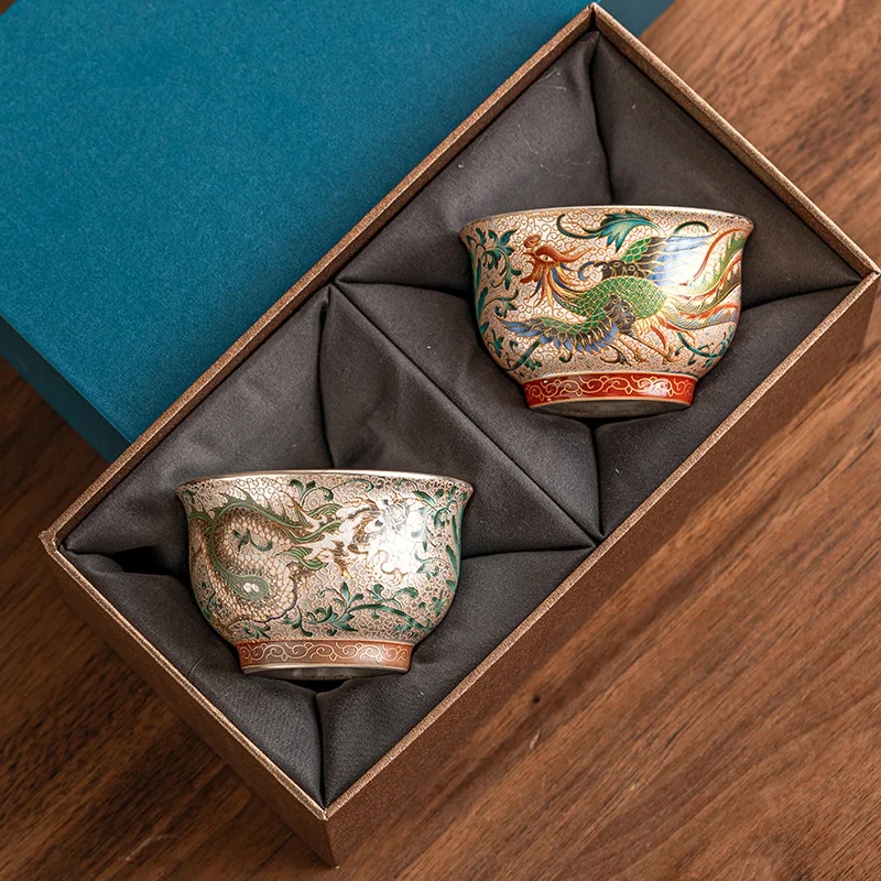 Tasse de couple Dragon et Phénix Chengxiang 140 ml, tasse de maître en argent 999, tasse de dégustation de thé haut de gamme de luxe léger, coffret cadeau pour service à thé