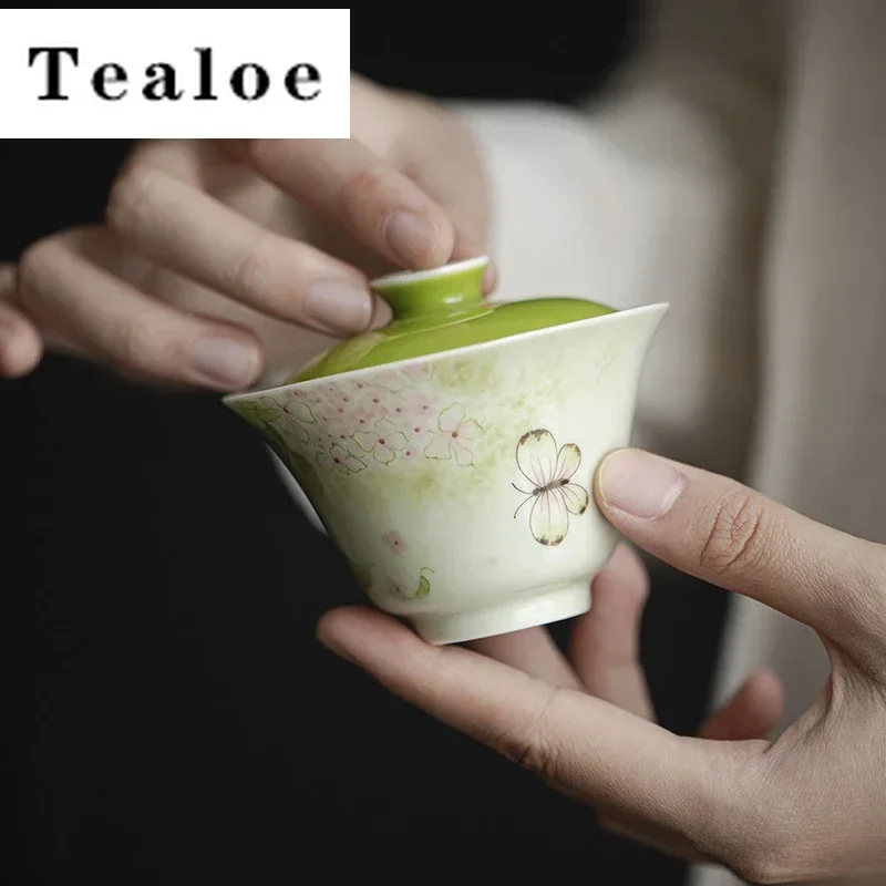 Ensemble Gaiwan en porcelaine peint à la main avec fleurs, 90ml, pour le thé, théière papillon, tasse, bols verts chinois, ensemble de cérémonie du thé Chawan