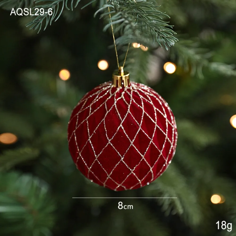 Boule de noël floquée en plastique à la mode, boule d'ornement de noël suspendue rouge et or, boules d'arbre de noël de 8cm pour la maison