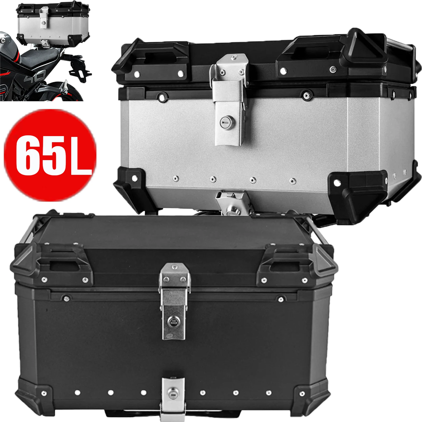 Valise à bagages en alliage d'aluminium pour coffre arrière de moto 65L, boîte de rangement arrière de moto à dégagement rapide, étanche et Absorption des chocs