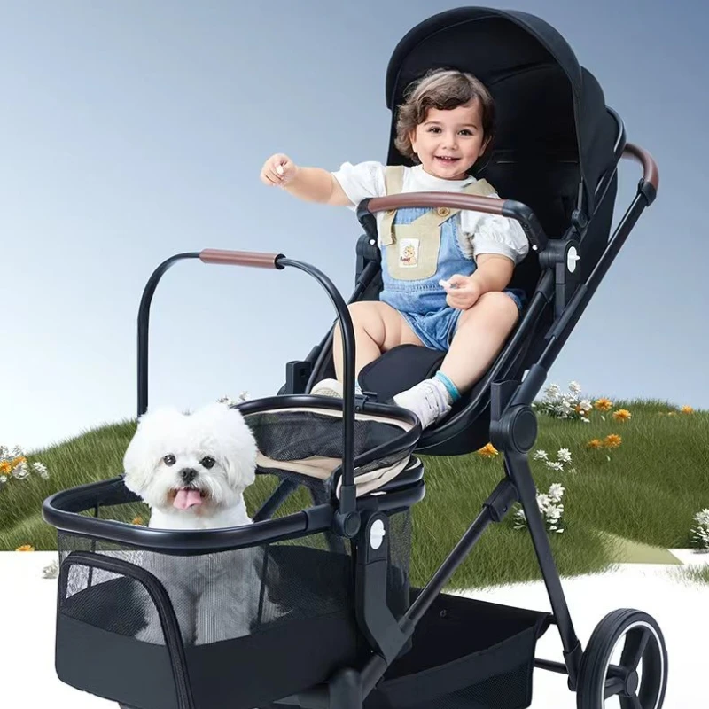 Cette poussette multifonctionnelle combine les fonctions pour bébé et pour animal de compagnie ; elle est détachable et peut être utilisée comme poussette autonome.