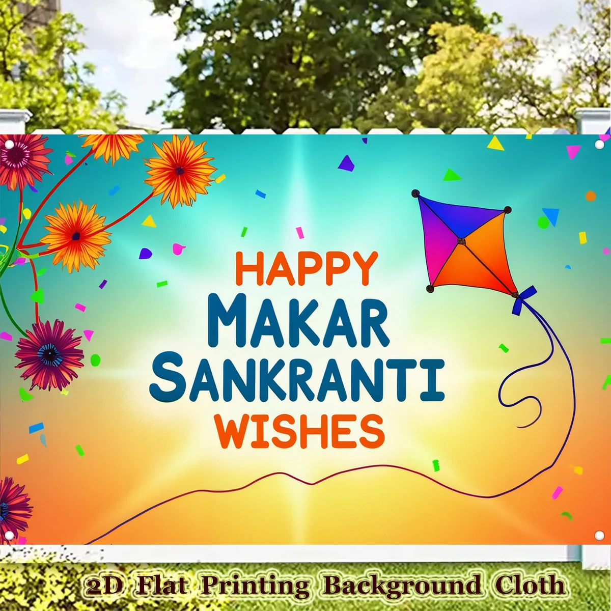 Bannière plate 2D pour fête du festival Makar Sankranti, 1 pièce, motif floral et cerf-volant vibrant, décor mural suspendu en polyester pour anniversaires,