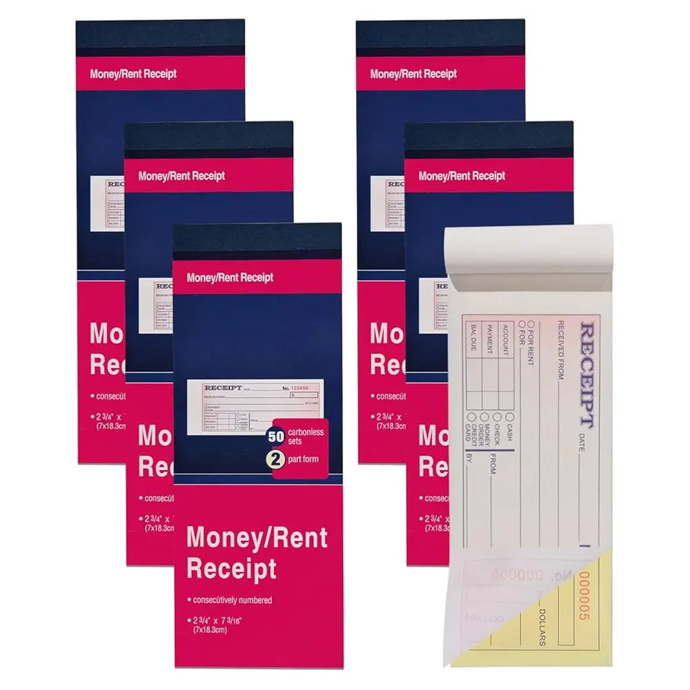 Ensemble de six livres de livres de reçus d'argent et d'alignement, mesurant 2,75 pouces x 7,19 pouces, double copie sans carbone, 50 jeux par livre.