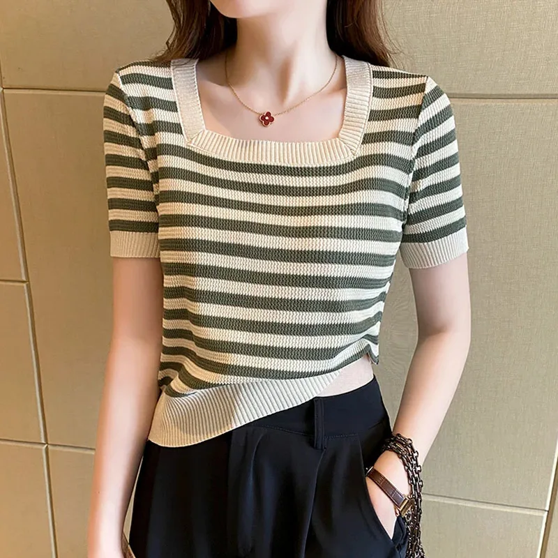Nouveau pull tricoté rayé à manches courtes pour femme, col carré ajusté, hauts tricotés Q3461
