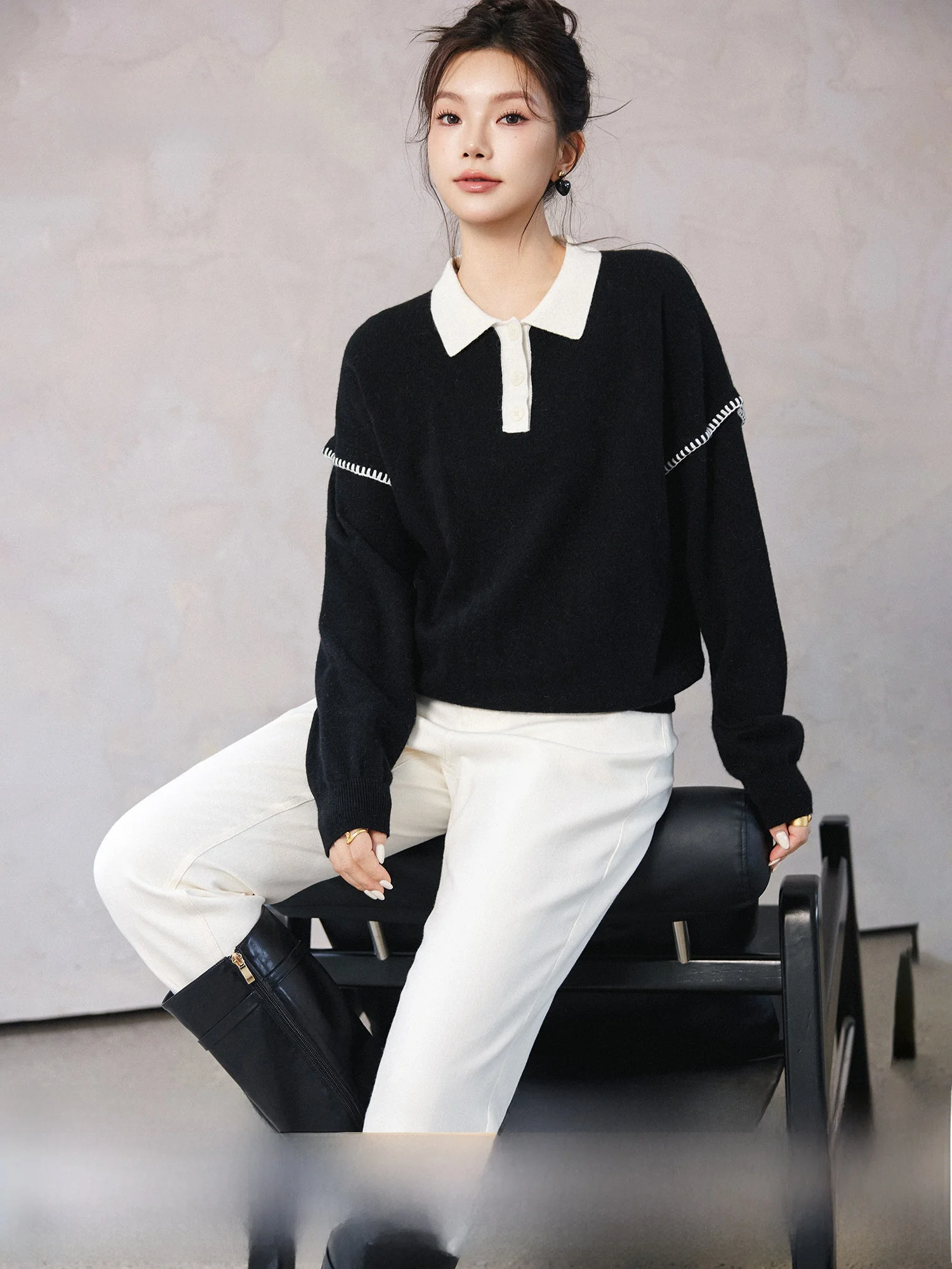 Pull en tricot style doux printanier pour femme, grande taille, col en mélange de laine, blocs de couleur, manches longues, col rond, Sp...