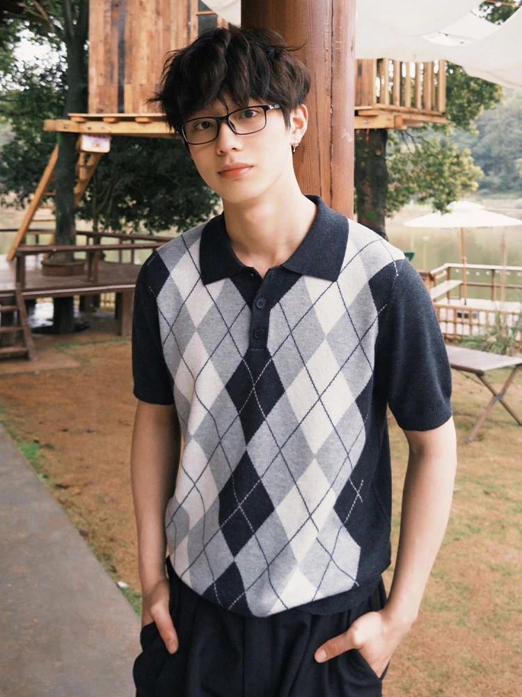 Chemise à manches courtes en tricot à motif diamant pour homme, style Old Money, col en laine, t-shirt rétro américain à demi-manches