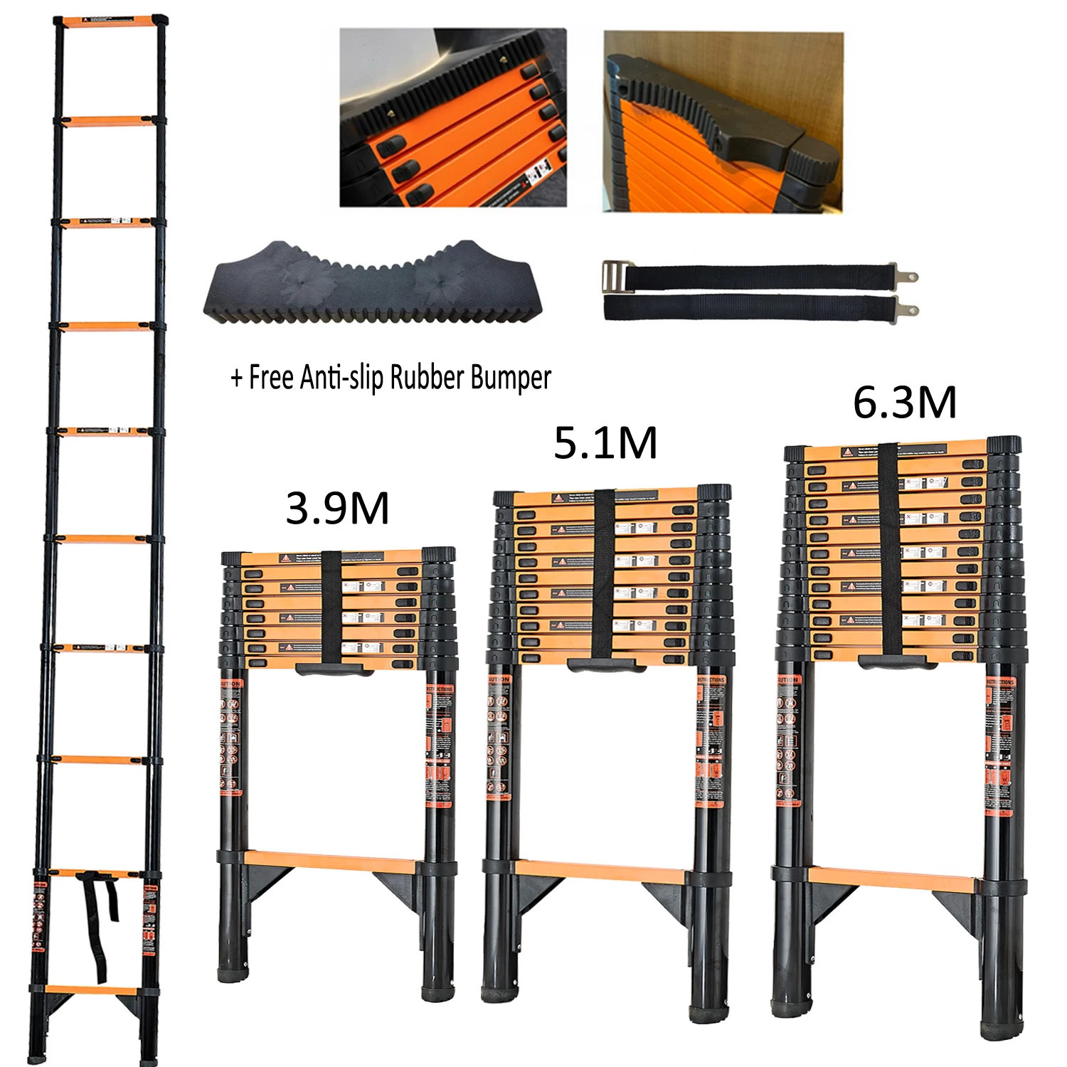Échelle télescopique 3.9m/5.1m/6.3m Extension pliante en acier au carbone Portable légère avec certifié EN131 charge maximale 150kg