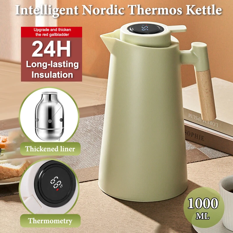 Bouteille isotherme 1000 ml, thermos nordique pour eau chaude, bouilloire intelligente, carafe, bouteille isotherme avec poignée en bois
