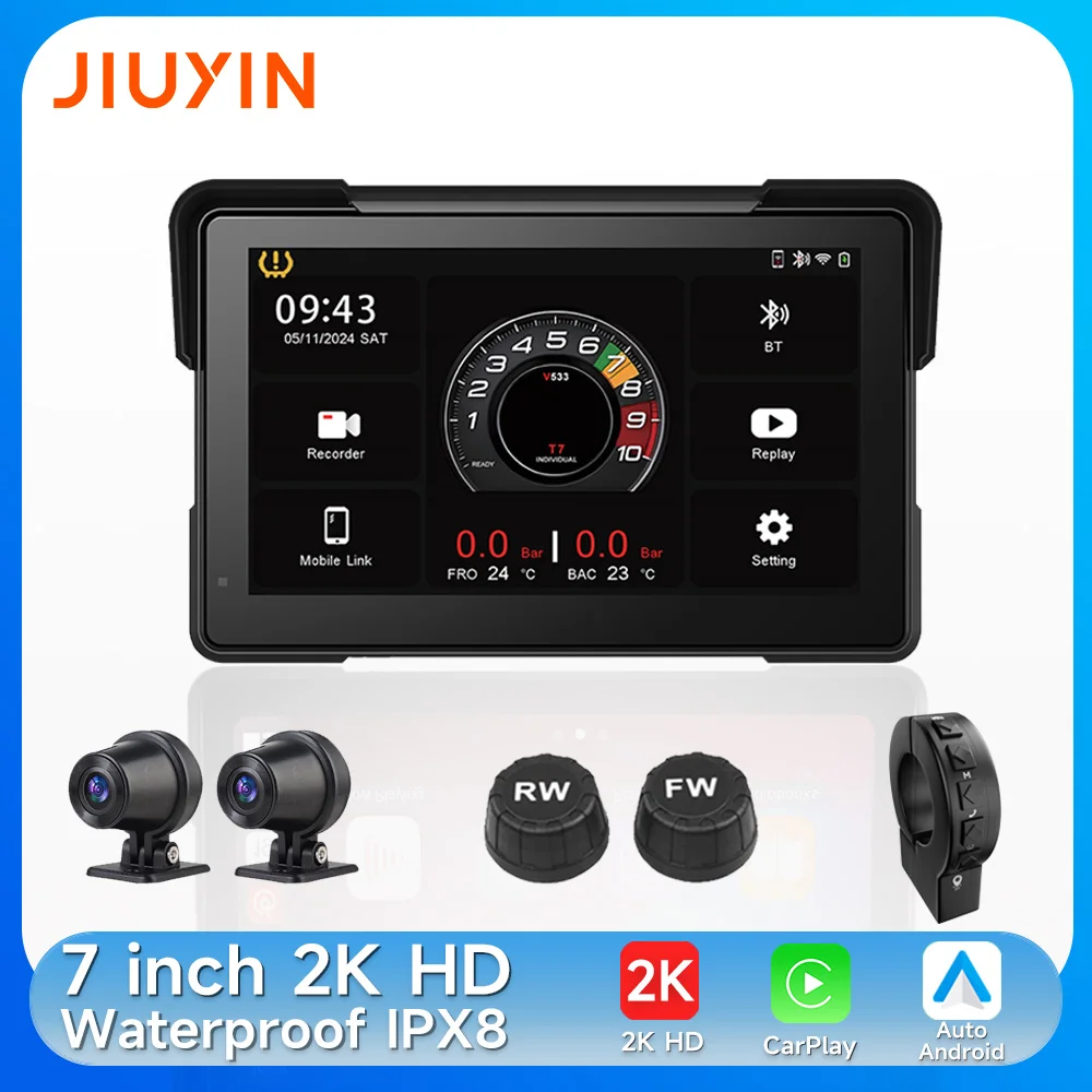 Lecteur multimédia de moto étanche, navigation GPS, enregistreur vidéo, CarPlay sans fil, Android Auto, IPX8, écran BT, 2K HD, 7 pouces