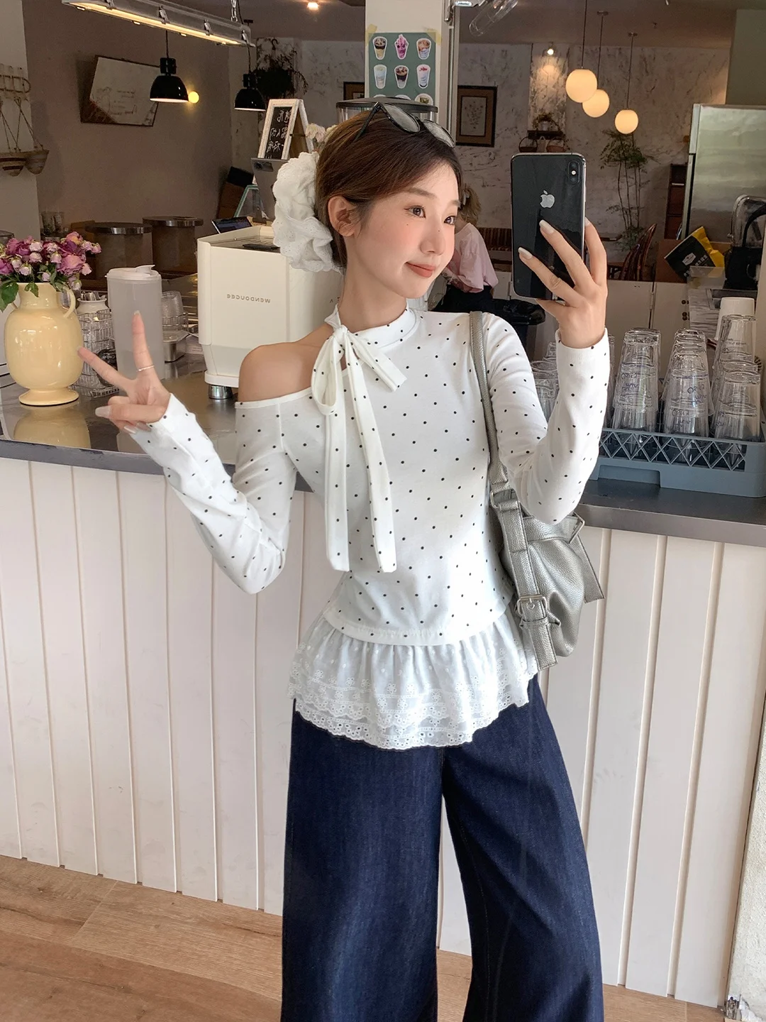 Haut amincissant pour femme grande taille, style français, avec patchwork de dentelle, manches bouffantes, col carré, cintrage à la taille, pour début d'automne, manches longues