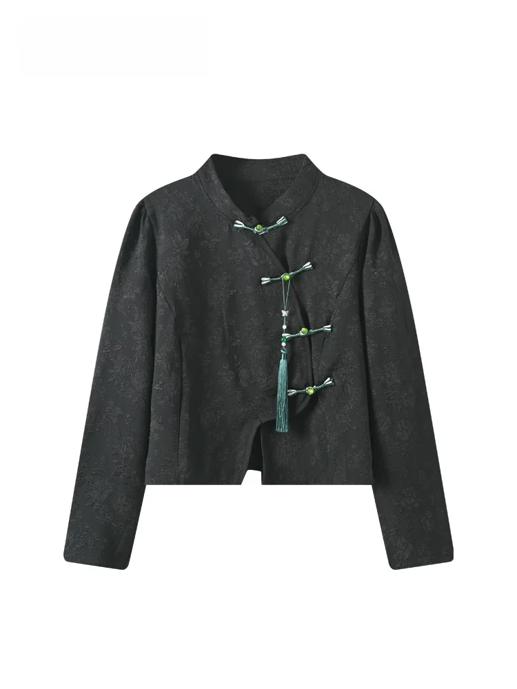 Chemisier vintage chinois à manches longues et col montant boutonné pour femme grande taille, idéal pour les sœurs rondes, collection Printemps, en bambou.