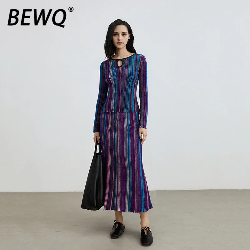 BEWQ Ensemble 2 pièces mode femme, col découpé, manches longues, rayé, color-block, tricoté, coupe ajustée, taille haute, soirée, nouvelle collection printemps 2026