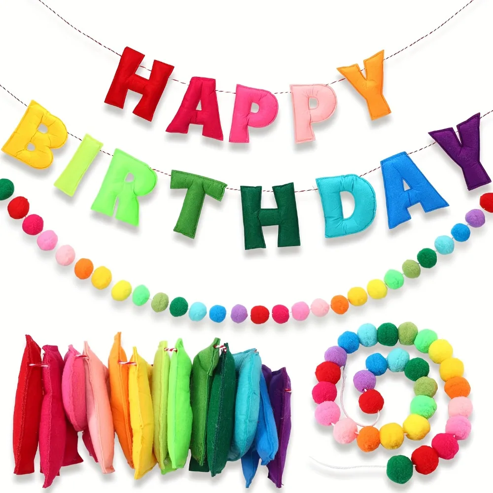 29 pièces (1 bannière + 28 pompons) ensemble de bannières joyeux anniversaire pré-enfilées colorées, comprend 28 boules de feutre-guirlande en tissu arc-en-ciel, parfait pour les décorations de fête et les accessoires photo, les décorations de fête d'anniversaire
