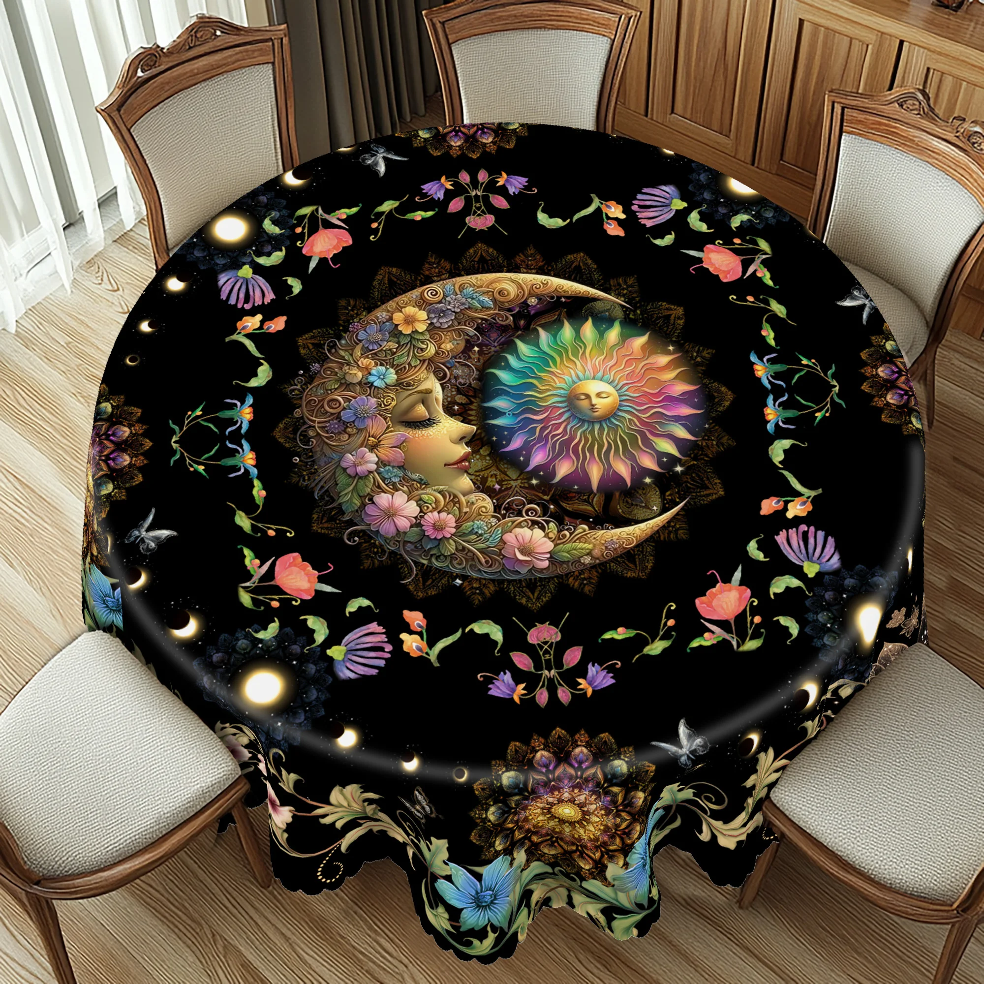 1 pièce de nappe décorative d'élément de tarot, nappe imprimée à motif de soleil et de lune raffiné, décoration de jeu d'occupation, processus de gaufrage des bords, adaptée à la décoration de fête quotidienne, ouvrant la décoration de la maison du maître