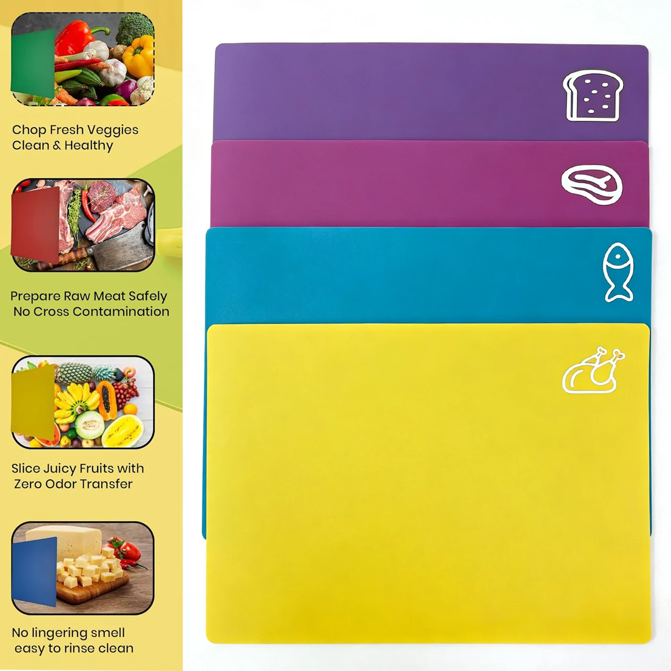 Set de 4 dessous-de-plat style icône, tapis coloré en plastique souple, planche à découper, sans BPA, non poreux, dos antidérapant
