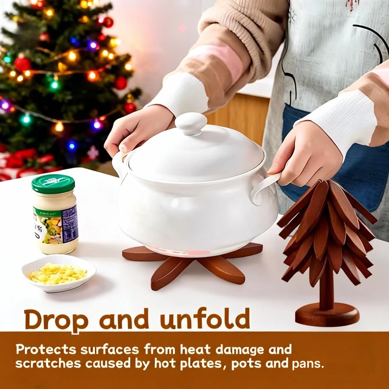 Tapis isolants en bois massif en forme d'arbre (2 ensembles) couleurs foncées et claires, 10 tapis + 2 bases indispensable pour la saison de Noël de qualité supérieure