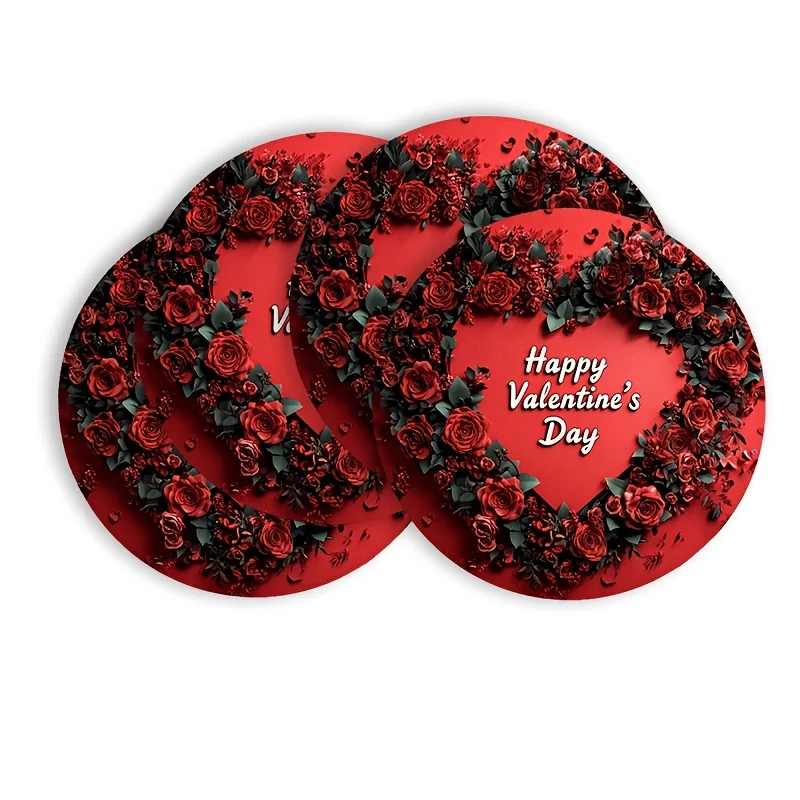 4 sets de table ronds pour la Saint-Valentin | Roses entourantes à motif en forme de cœur de 15 pouces avec écrit "Joyeux Saint-Valentin"