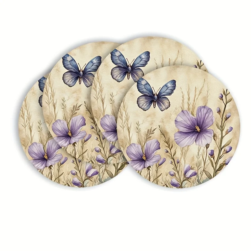 Napperons ronds de printemps 4 pièces-conception de fleurs sauvages violettes aquarelle et papillons bleus, tapis de Table en Polyester durables de 15 pouces