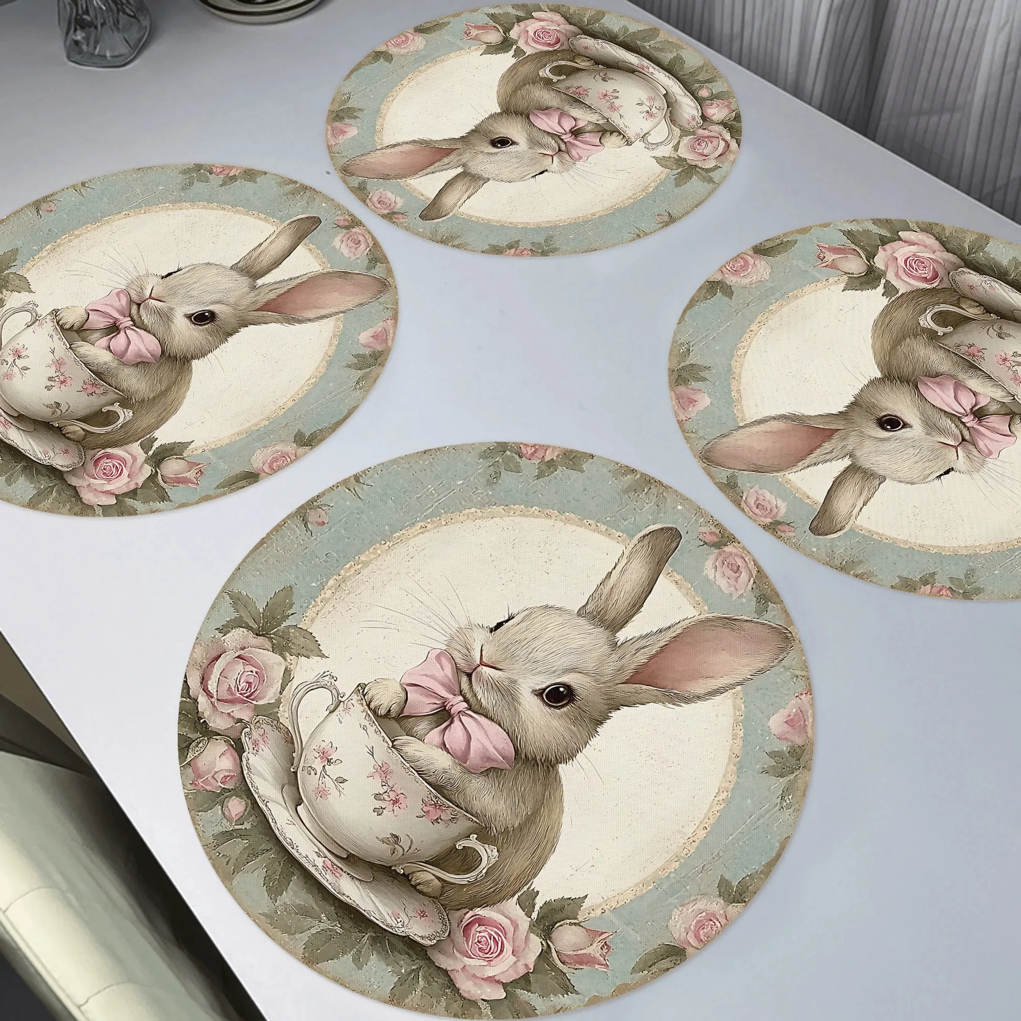 4 pièces tapis de table ronds lapin et roses, 15x15 pouces, 100% polyester, tissé, lavable à la main, antidérapant, durable