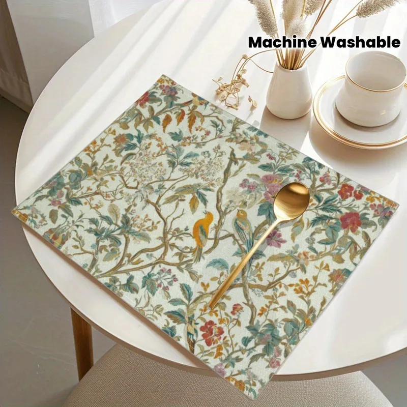 VIKAMA Lot de 4 sets de table à motif d'oiseaux et de fleurs, style rustique, imperméables et antidérapants, pour la maison, la salle à manger, le café, la décoration de vacances
