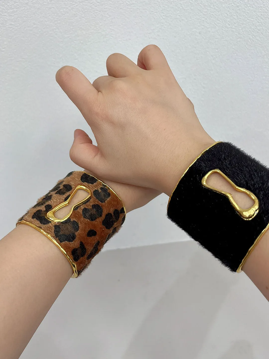 Bracelet de luxe haut de gamme en velours floqué, motif léopard, en alliage poli argent et or, pour femme
