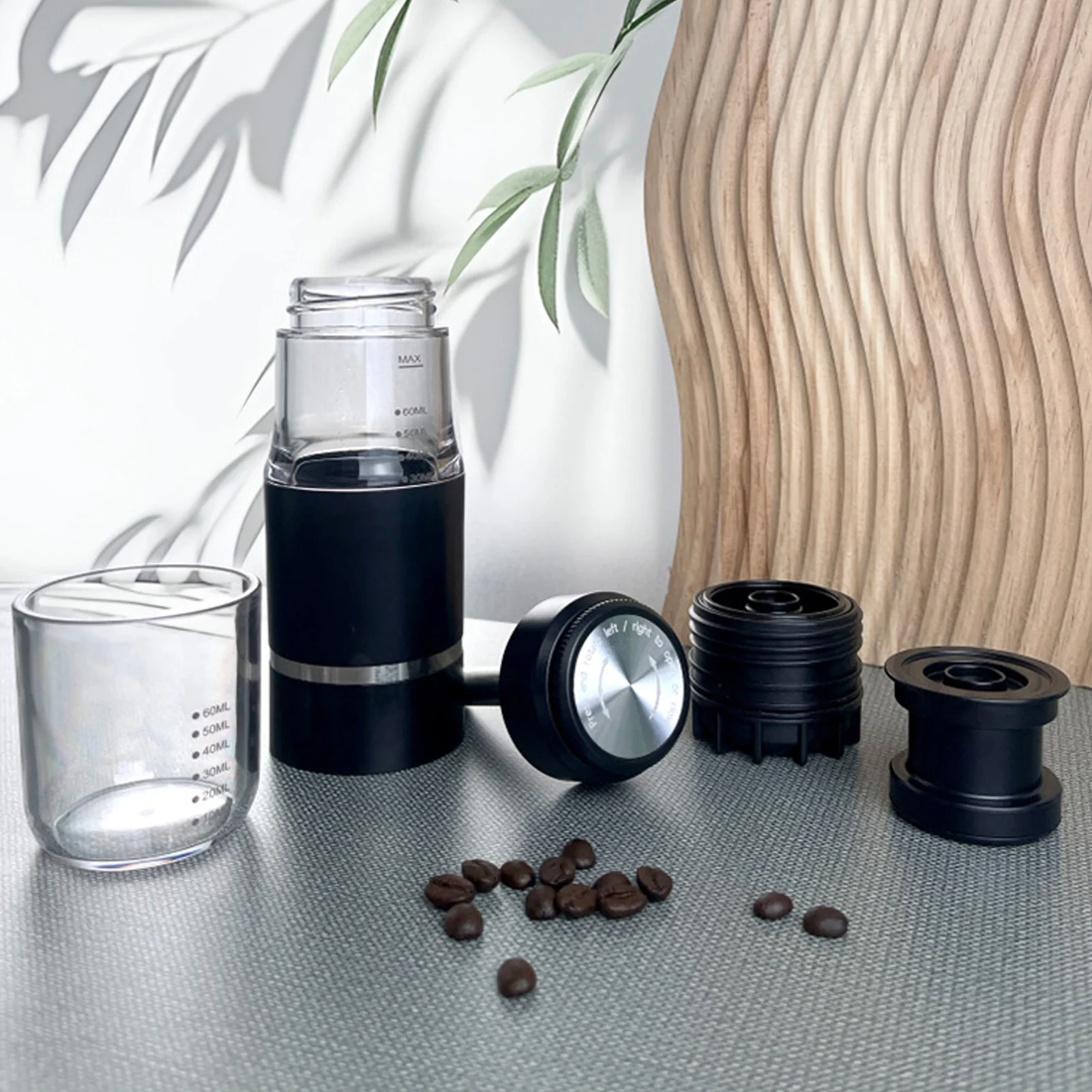 Cafetière tout-en-un adaptée aux voyages – Moulin intégré, Machine à expresso portative et Mini tasse versée pour la maison et l'extérieur