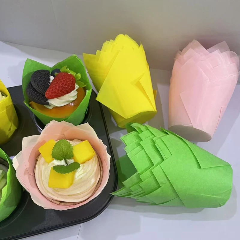 50 moules à gâteau en forme de tulipe, jaunes, roses et verts, résistants à la graisse, parfaits pour les muffins, les cupcakes et les desserts de fête, les mariages, les festivals et les occasions spéciales