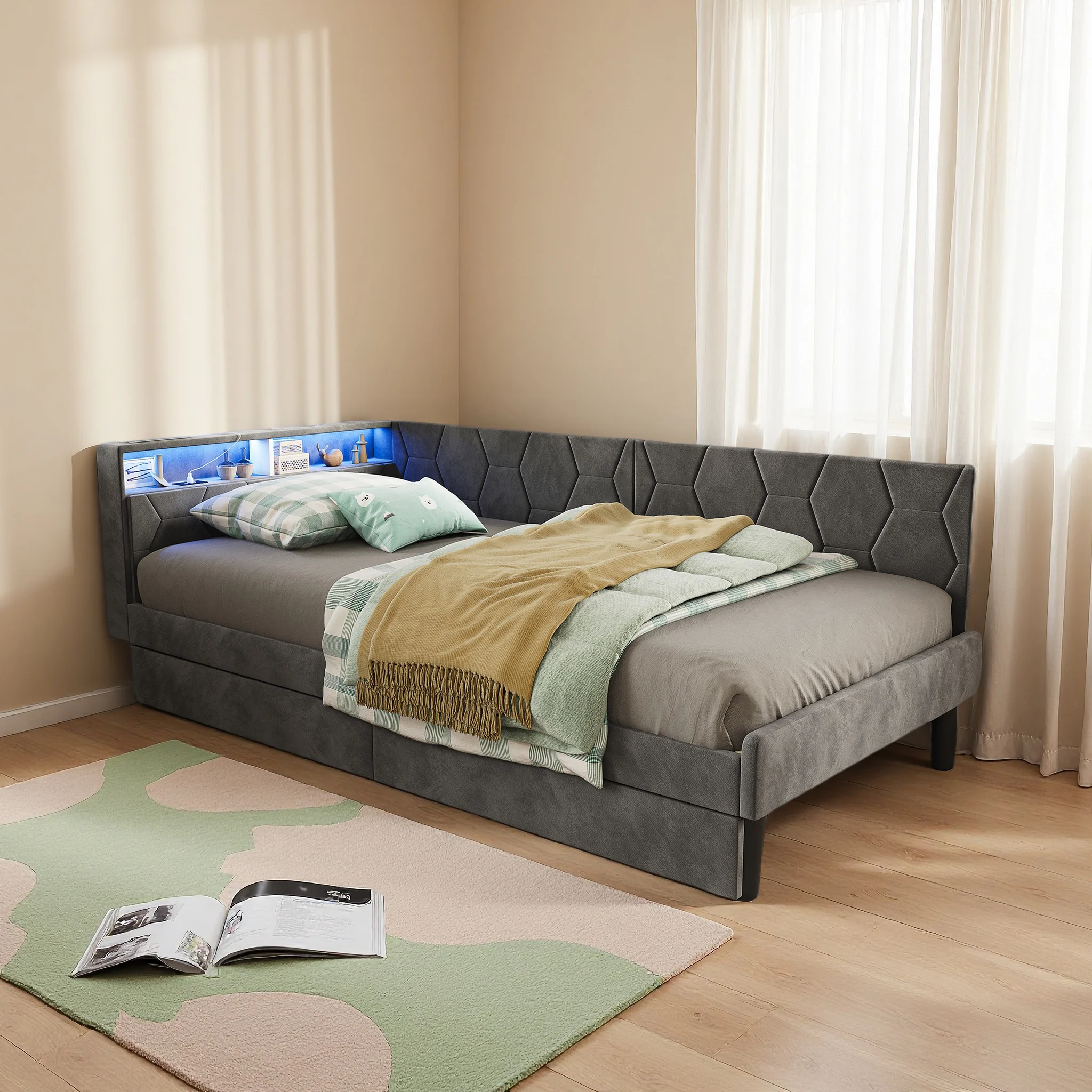 Canapé-lit Comanlai, lit simple/double rembourré avec 2 tiroirs, canapé-lit pour jeunes avec fonction LED et chargement USB, velours