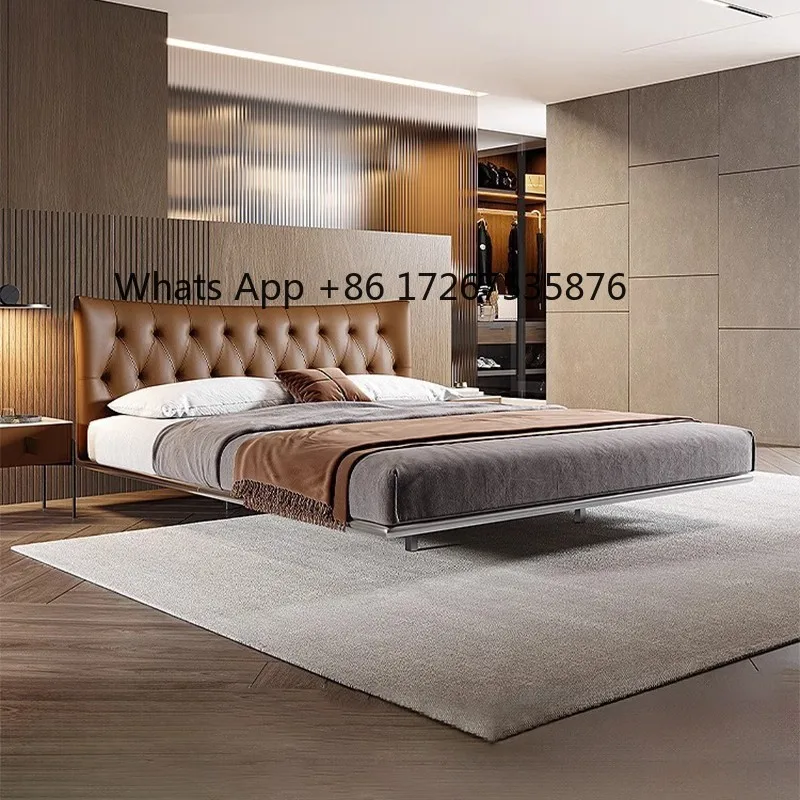 Lit suspendu en acier au carbone, style italien minimaliste, avec revêtement en cuir, lit double pour chambre principale, lit queen-size suspendu