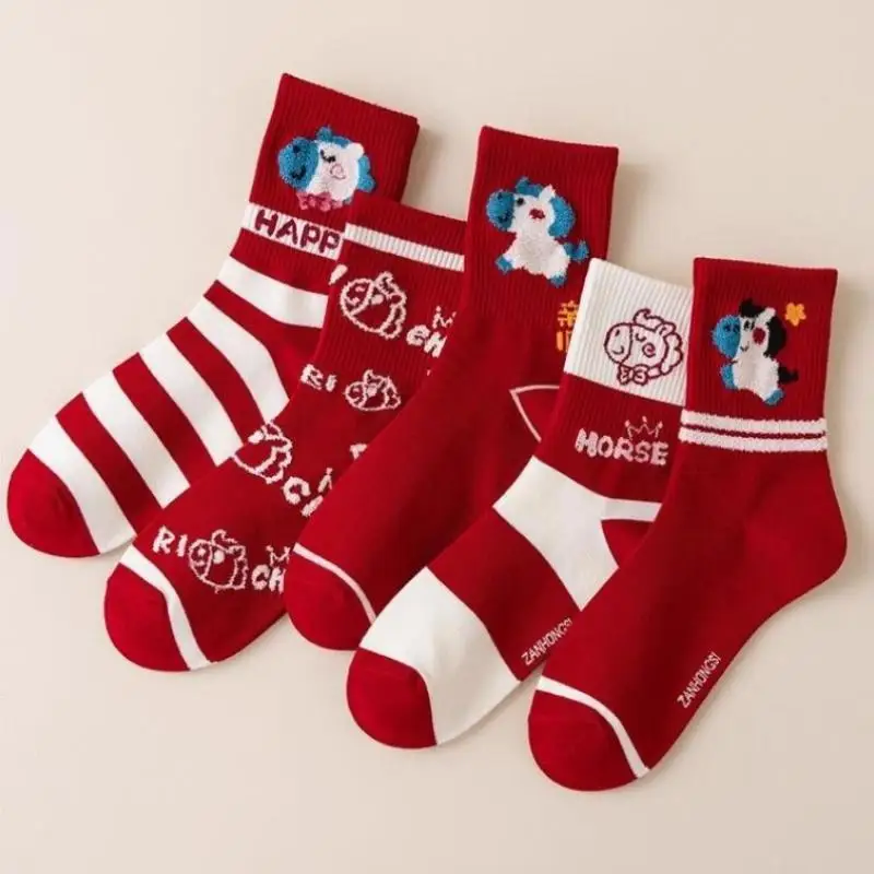 Chaussettes mi-tube chaudes d'automne et d'hiver, motif dessin animé mignon du zodiaque, année du cheval, chaussettes rouges du nouvel an, cadeaux