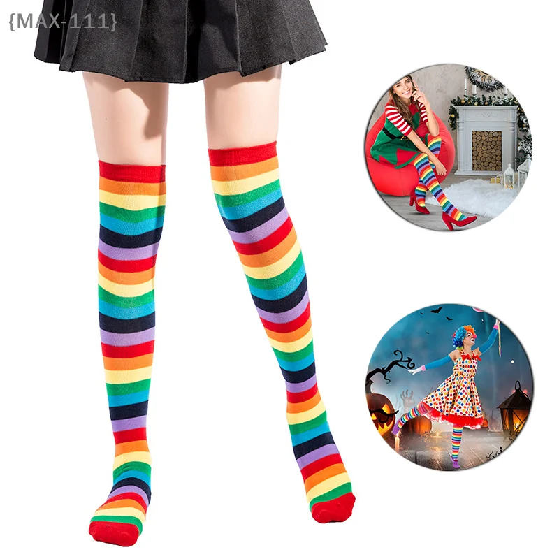 【F2-MAX-111】Chaussettes rayées arc-en-ciel jusqu'aux genoux - Bas cuissardes pour Noël, cosplay et soirées costumées