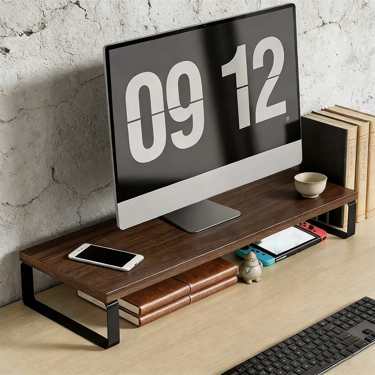 Support d'écran en bois avec pieds métalliques - Organisateur de bureau ergonomique pour ordinateur, ordinateur portable, bureau et maison - Style industriel rustique