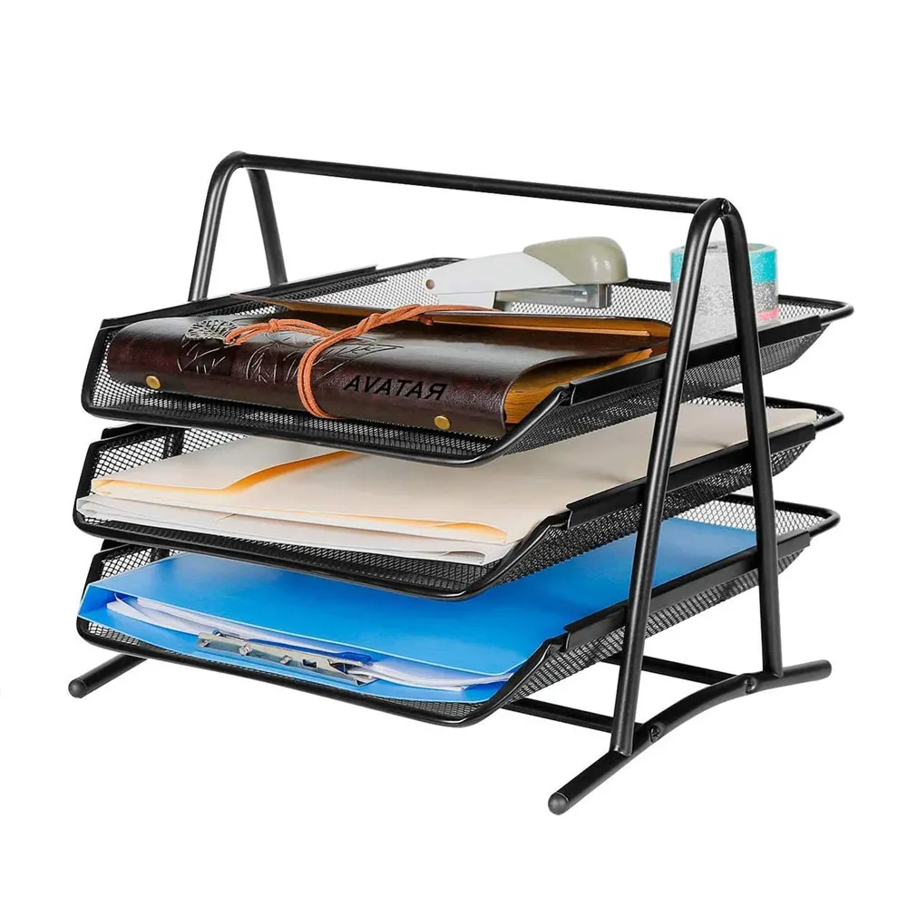 Organisateur de fichiers de bureau coulissant à trois niveaux, porte-fichiers/documents/lettres/A4 en maille métallique avec séparateurs coulissants - noir