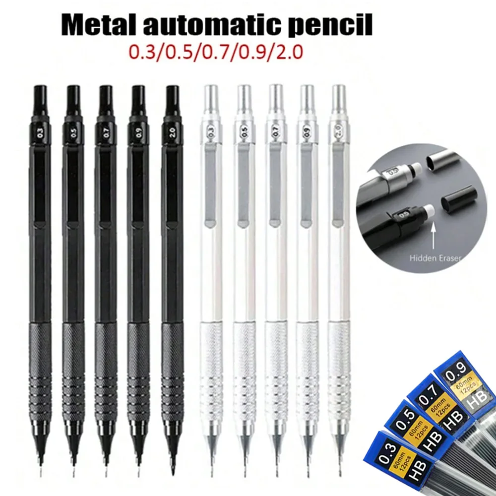 Crayons automatiques de dessin, 0.3 0.5 0.7 0.9 2.0mm, pointe rétractable à Center de gravité bas, crayon mécanique en métal avec gomme