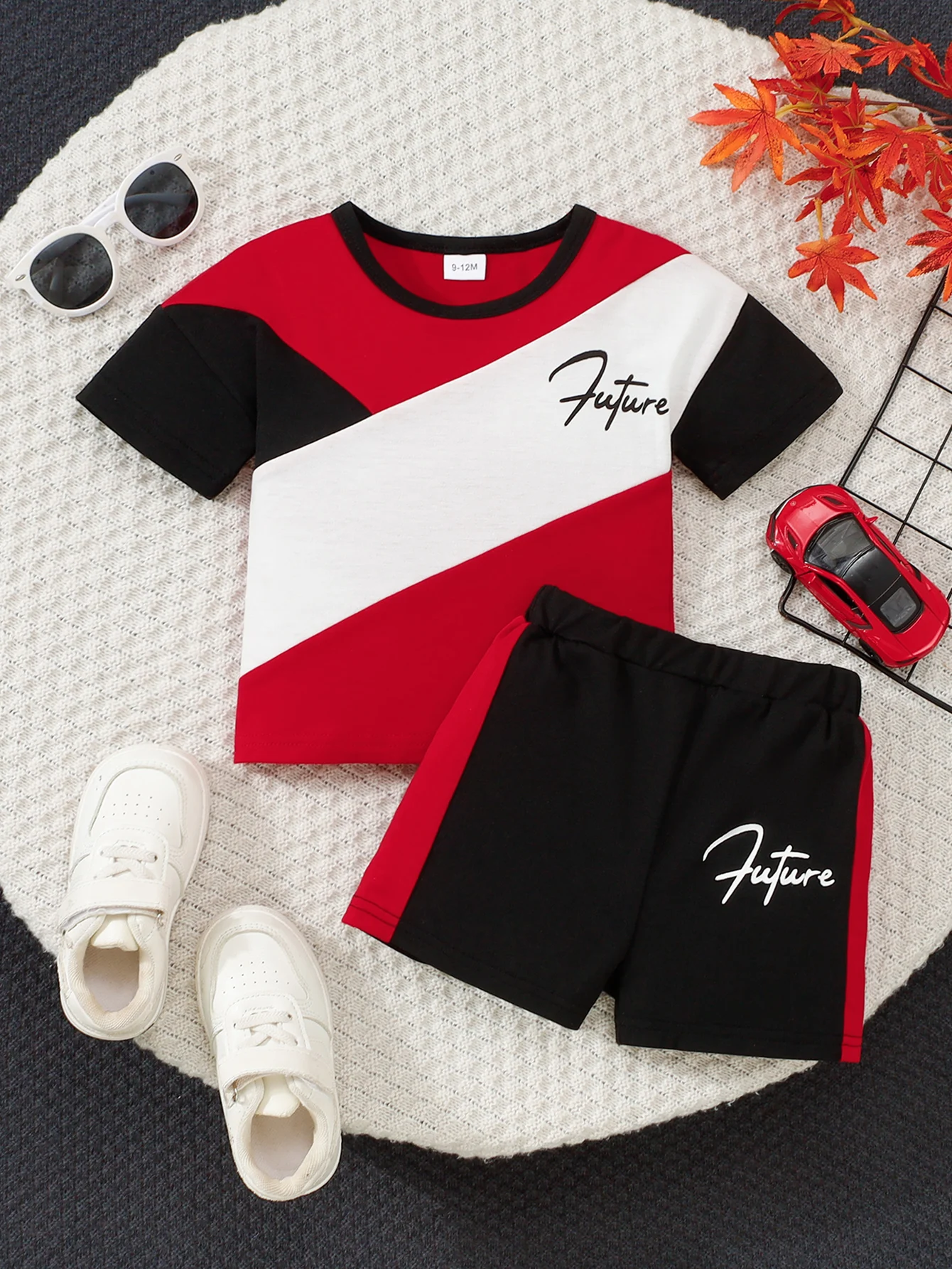 Ensemble décontracté 2 pièces pour bébés garçons d'été (6-12 mois) : T-shirt à manches courtes imprimé « Future » color block rouge, noir et blanc et short à taille élastique