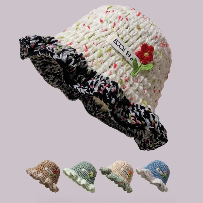 Nouveau coréen couleur mixte à la main tricoté seau chapeau femmes automne et hiver chaud doux fleur décorative à large bord bassin casquette