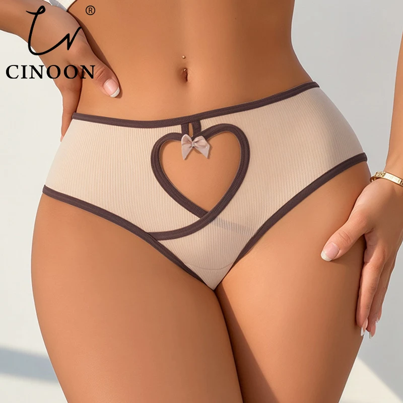 CINOON Culottes côtelées taille basse pour femme, sexy, avec découpe cœur et nœud, douces, respectueuses de la peau, très élastiques, respirantes, lingerie délicate