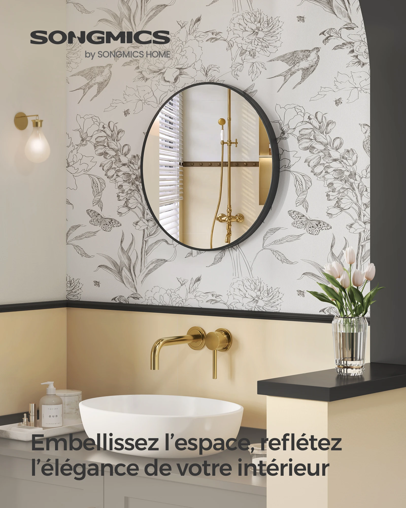SONGMICS Miroir Rond, Miroir Mural, Diamètre 61 cm, Cadre en Métal, Facile à Installer, pour Salle de Bain, Salon, Chambre, Entrée, Couloir