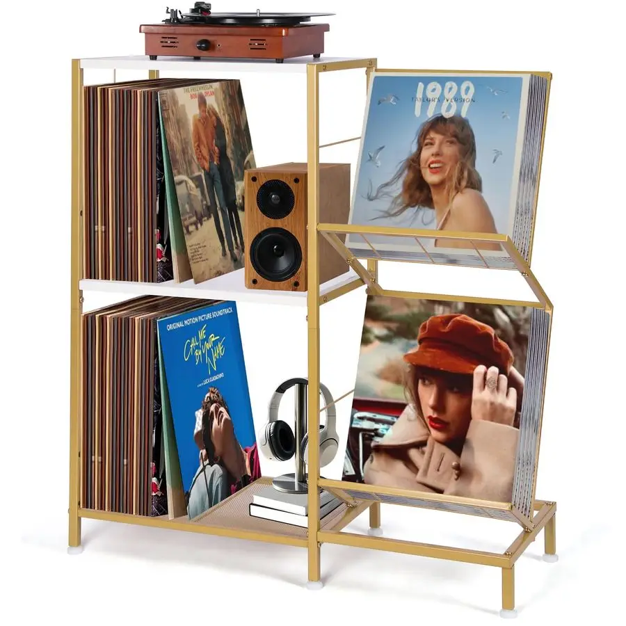 Tourne-disque avec support en vinyle à 2 niveaux, armoire en vinyle avec cadre en métal, plateau tournant mobile pour salon, or blanc