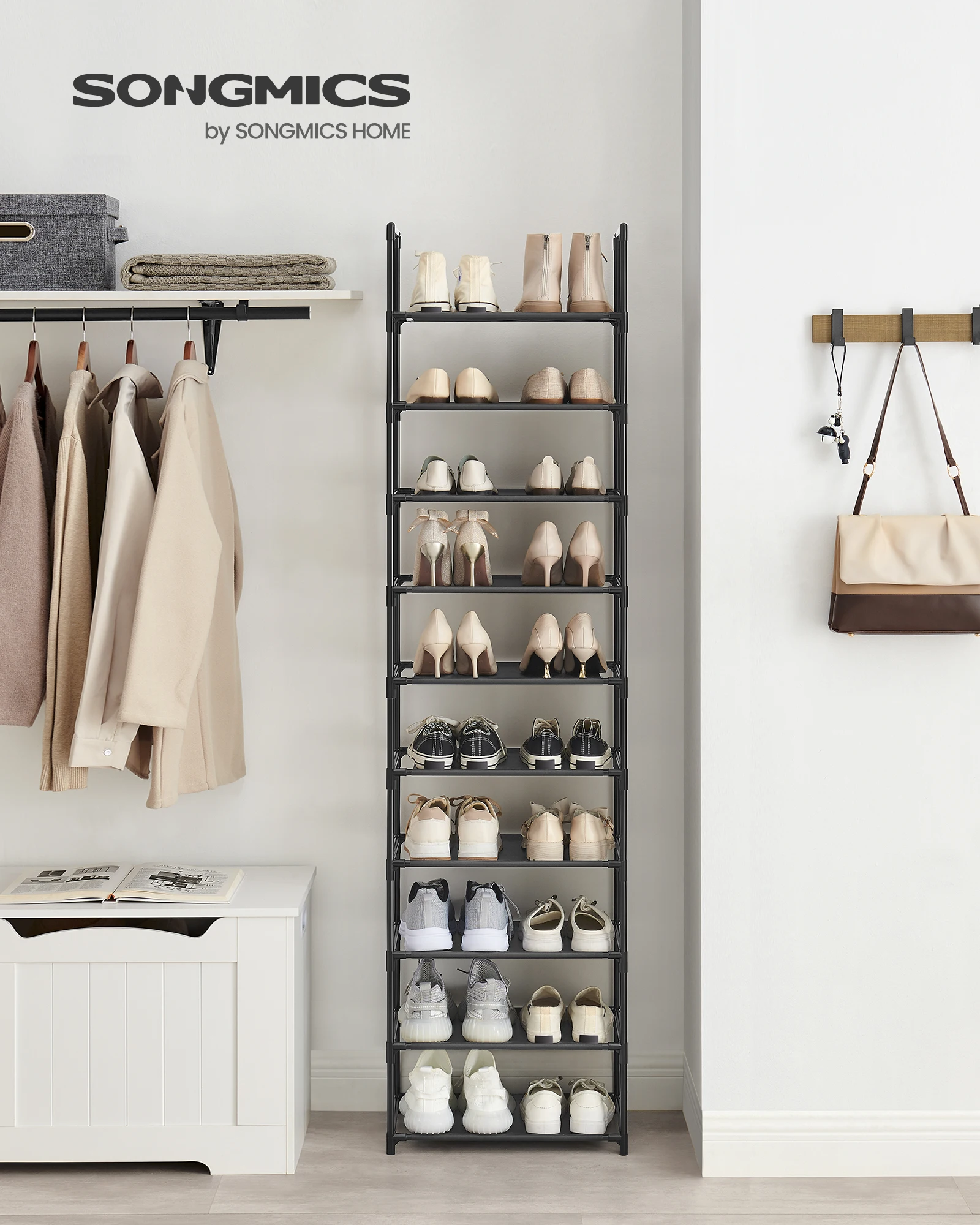 SONGMICS Étagère à Chaussures 10 Niveaux, Porte-Chaussures Haut, Support à Chaussures Fin, Rangement Chaussures, en Métal, Gain de Place, Dressing, Entrée, 30 x 94 x 206 cm