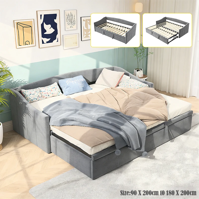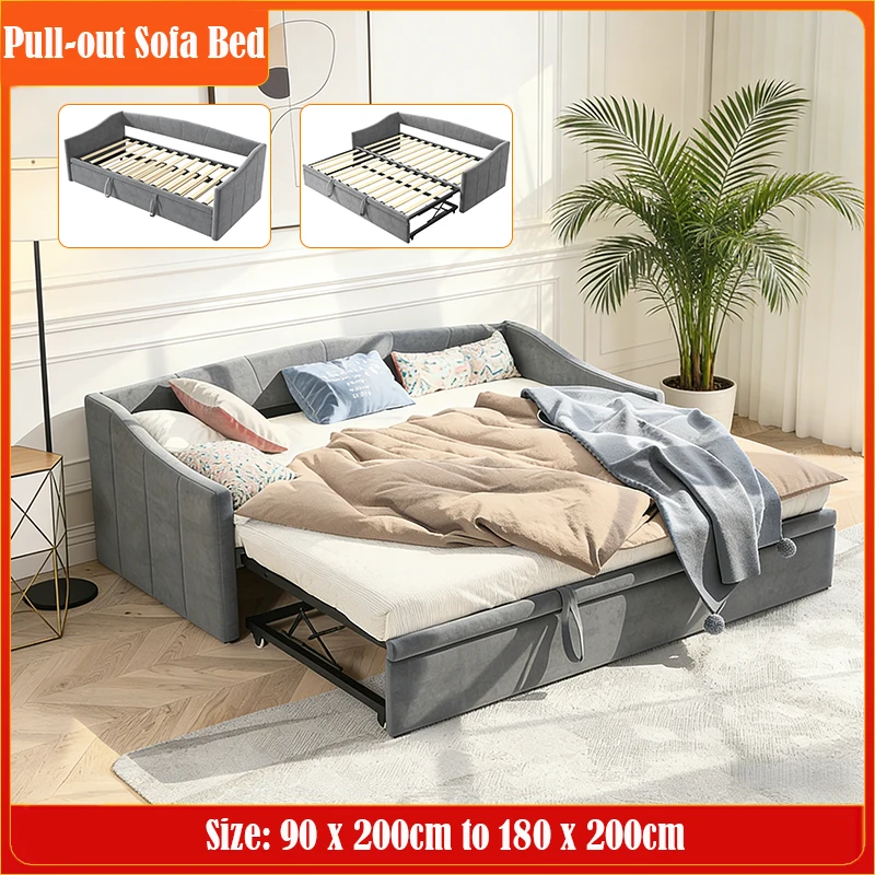 Canapé-lit escamotable, 90 x 200 cm à 180 x 200 cm, lit multifonctionnel, tissu en velours gris, avec sommier à lattes