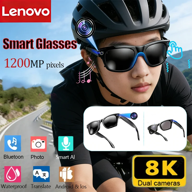 Lunettes intelligentes Lenovo AI 8K avec caméra, traduction, changement de couleur, étanches, enregistrement vidéo, appel photo, lunettes de soleil intelligentes
