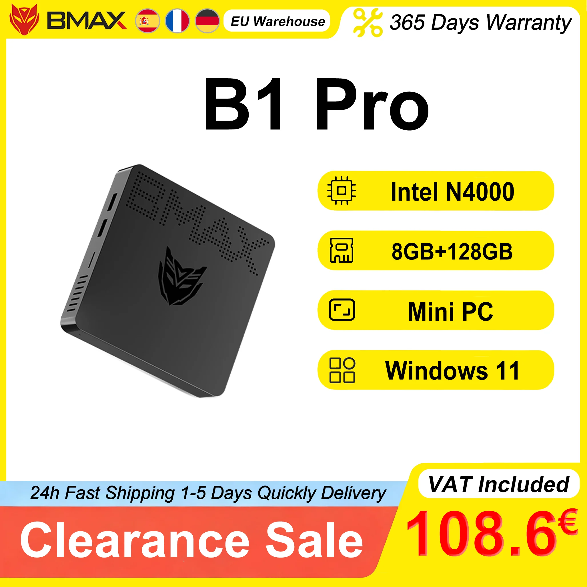 Mini PC BMAX B1 Pro 8 Go de RAM 128 Go de SSD Intel N4000 Windows 11 BT4.2 Intel UHD Graphics 600
