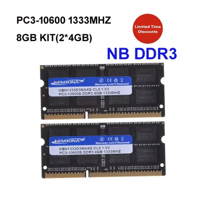 KEMBONA – Ram DDR3 SODIMM, 1333Mhz, 8 go (Kit de 2x4 go), PC3-10600/4 go, pour ordinateur portable