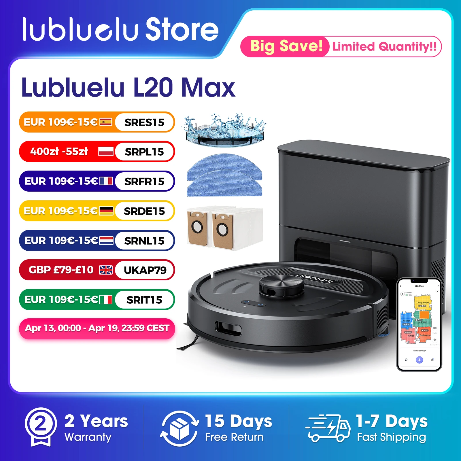 Lubluelu L20Max Robot aspirateur 3 en 1 auto-svuant - Aspirateur 6000 Pa LiDAR Navigation Grand sac à poussière mains libres 120 minutes d'autonomie
